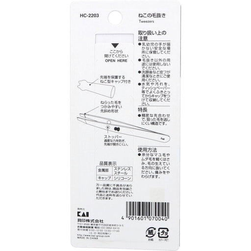Kai Corporation Cat Tweezers Angled Tip Silver with Cap Made in Japan